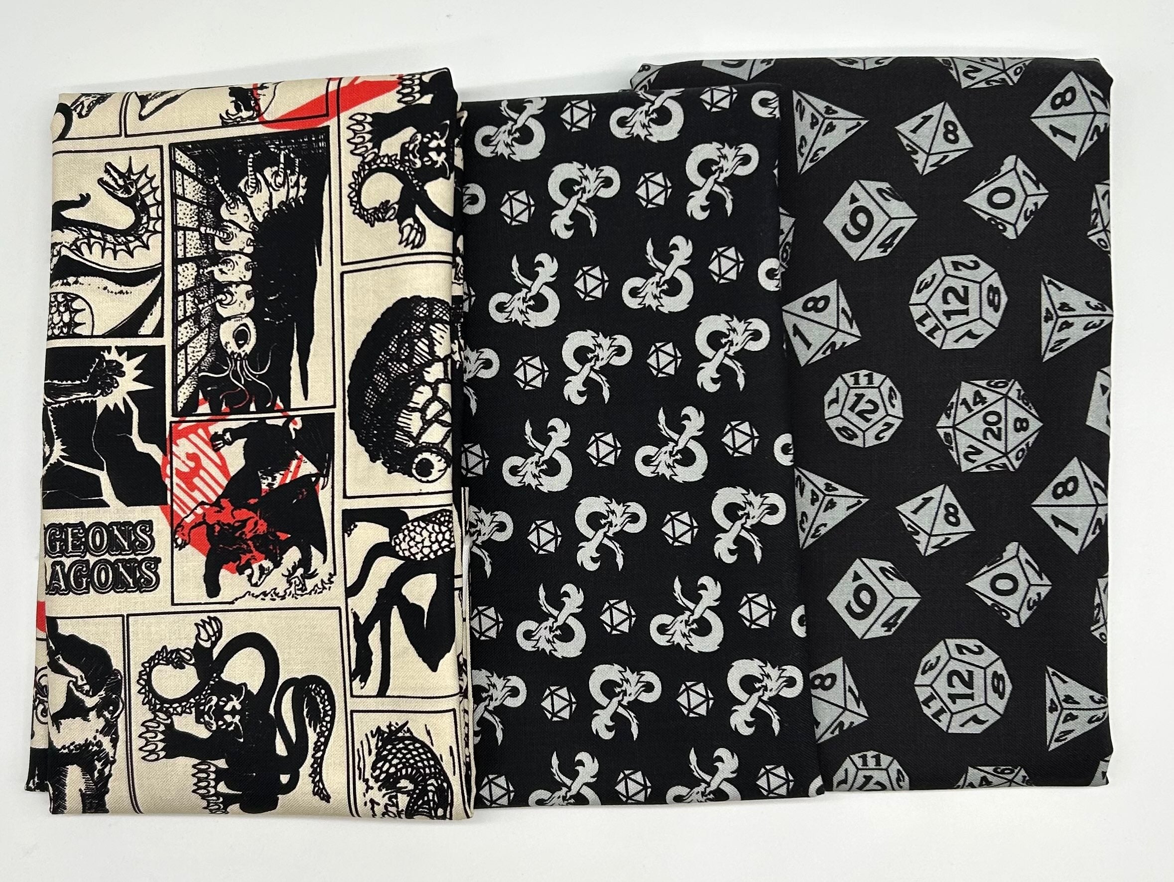 Handfuls of iconic dice, legendary monsters, and classic tabletop tropes black/red on cream.