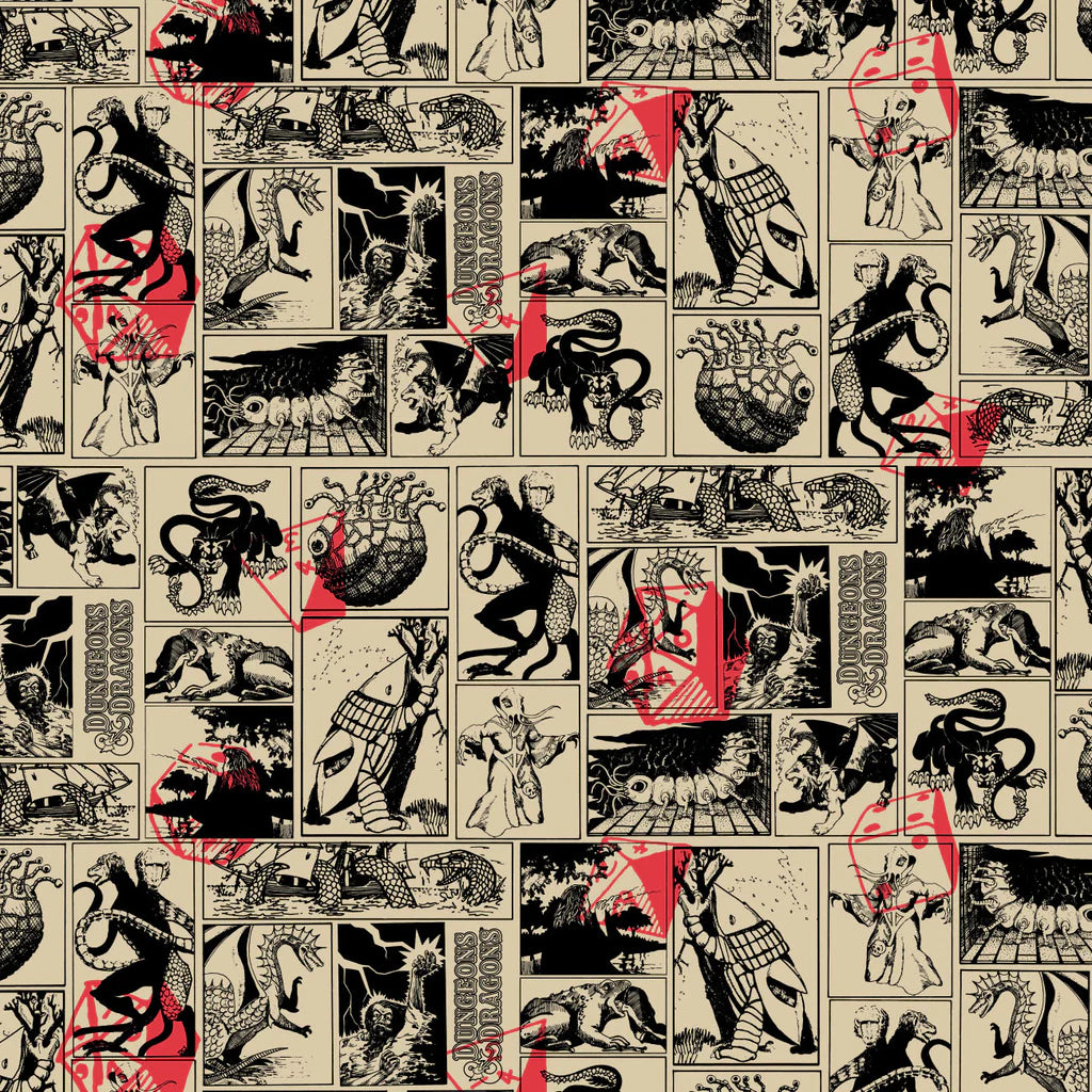 Handfuls of iconic dice, legendary monsters, and classic tabletop tropes black/red on cream.