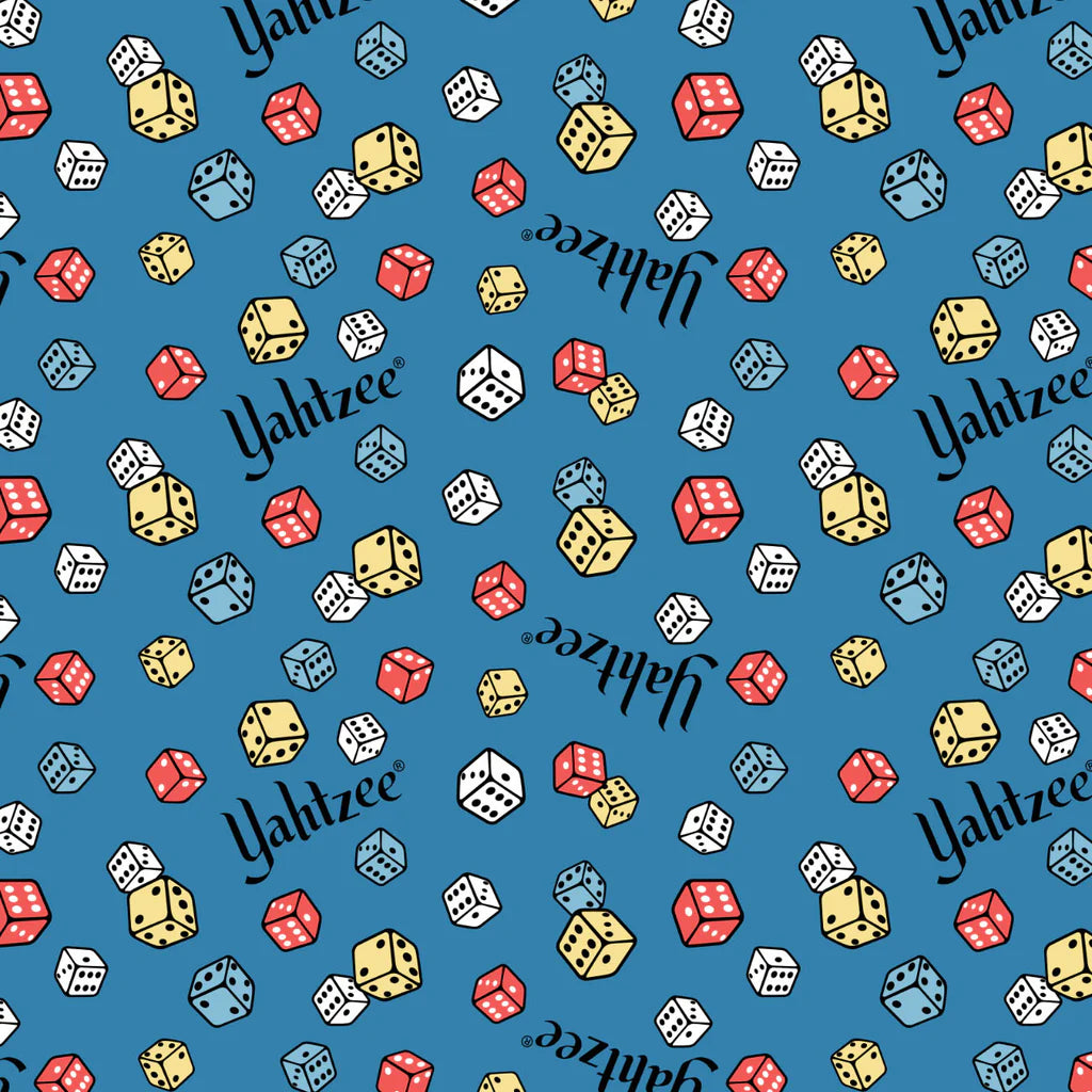 Yahtzee dice in blue, red, yellow and white with the word Yahtzee in black on blue background.