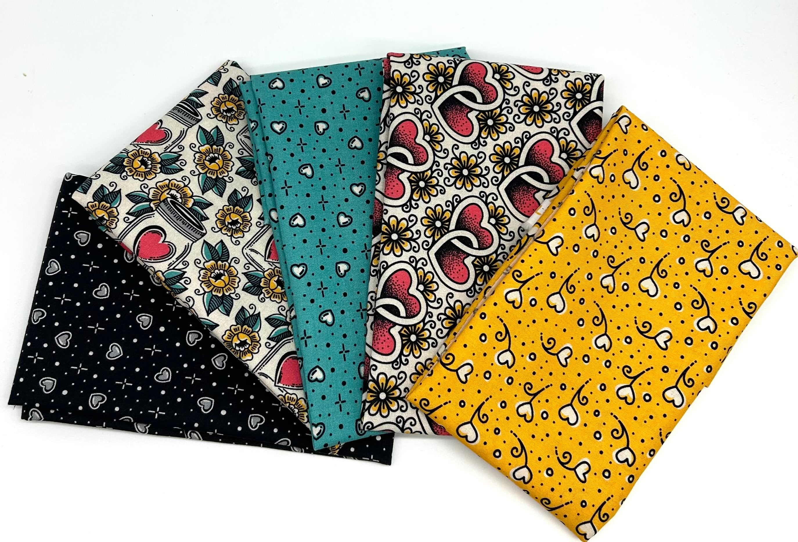 Tattoo style print - hearts, dashes, in deep pink, yellow, teal and black.