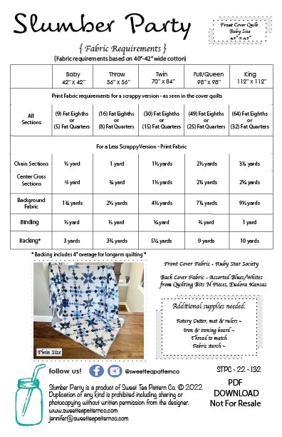 Printed Paper Pattern Final Product: Quilt Finished Size: 42" x 42" Baby; 56" x 56" Throw; 70" x 84" Twin; 98" x 98" Queen; 112" x 112" King Technique: Standard Machine Sewing Skill Level: Confident Beginner