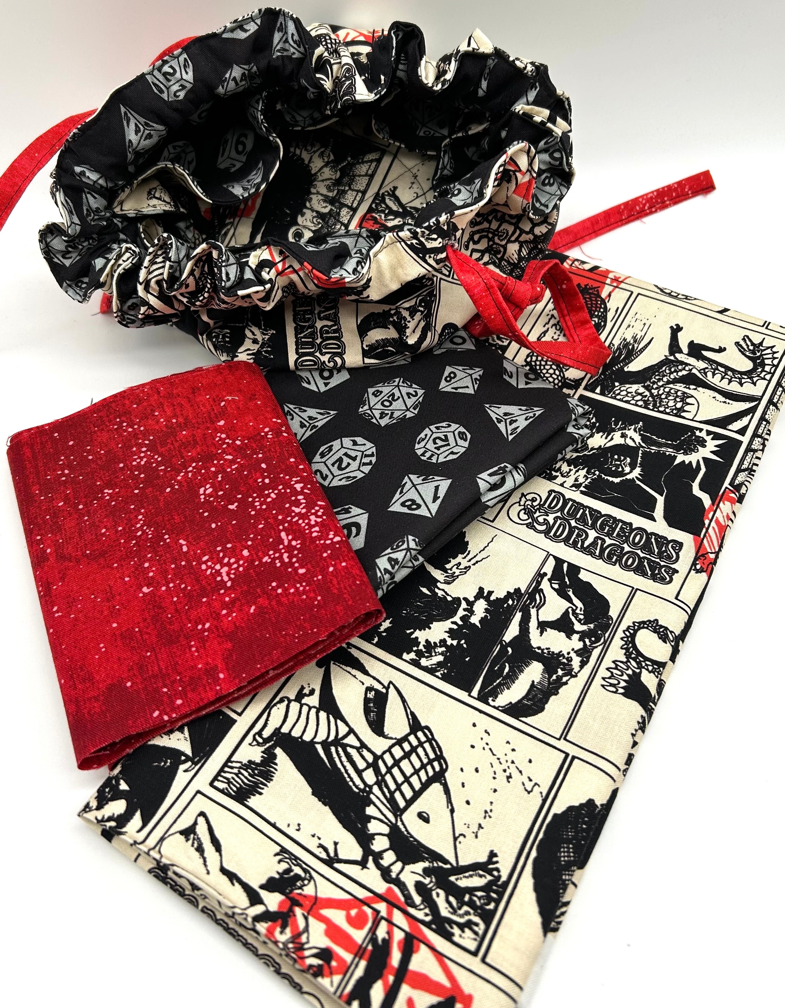 Handfuls of iconic dice, legendary monsters, and classic tabletop tropes black/red on cream and coordinating dice fabric to make a great dice bag. Kit includes fabric and pattern. Also need 6x6 piece of fiber form for bottom and optional Woven Fusible interfacing 1/2 yd.