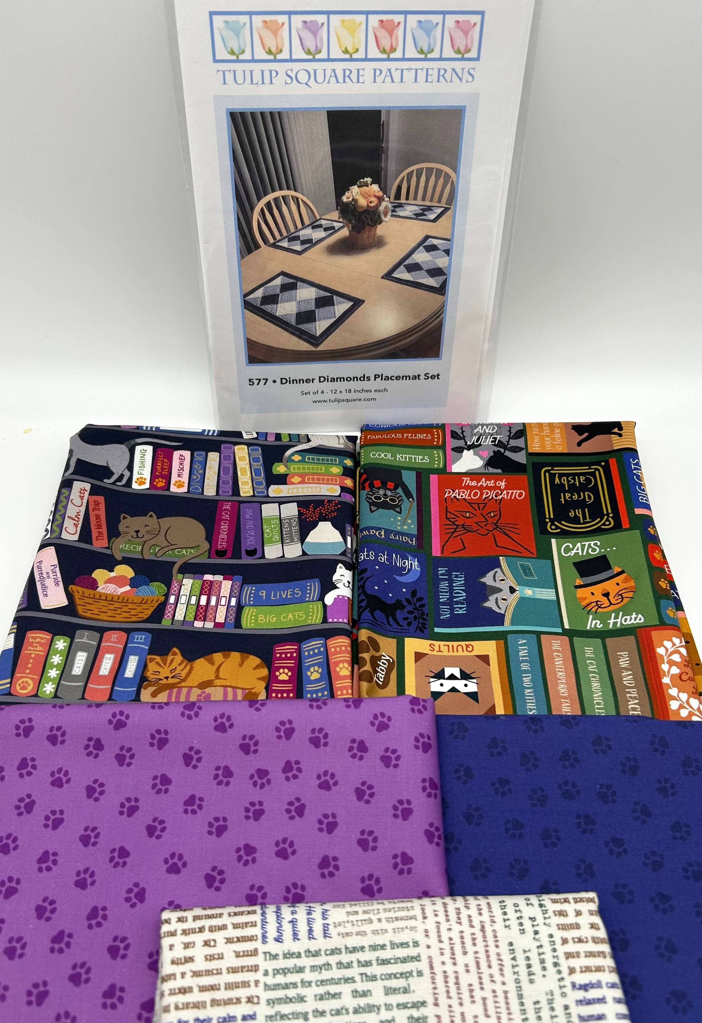 Cats in the books! Multi colored - this kit contains two book prints, perfect sayings, and two paw prints to make 4 placemats using Tulip Square - Framed Florals Pattern Each placemat is 12" x 18"